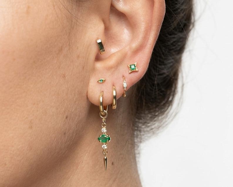 עגילי קרן זהב 14 קראט משובץ אמרלד ויהלומים